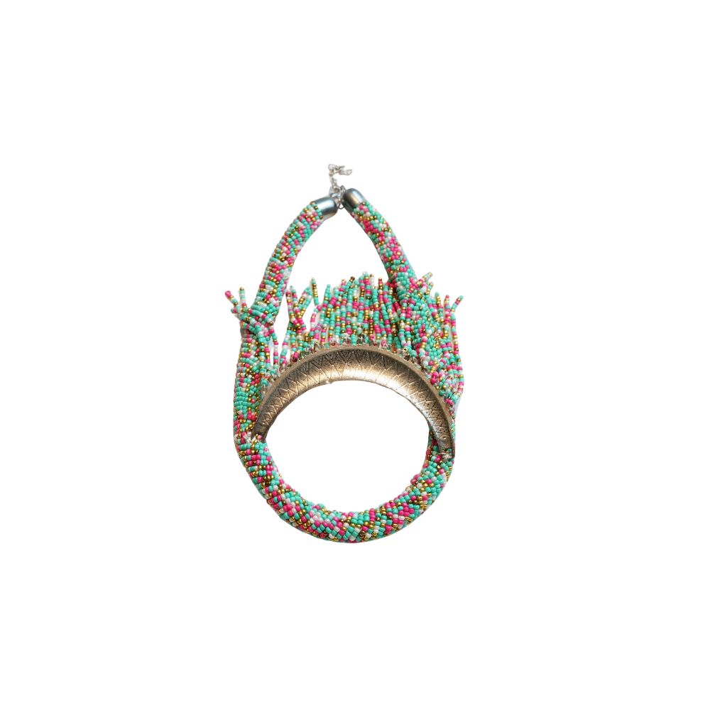 This beautiful handcrafted nickel collar represents the rich cultural heritage of the Oromo people of Ethiopia. Meticulously made by skilled artisans, this traditional piece features a sturdy nickel base adorned with vibrant plastic beads in traditional colors. The decorative elements showcase intricate beadwork reflecting centuries of Ethiopian craftsmanship. Perfect for those seeking authentic cultural jewelry or unique ethnic accessories.